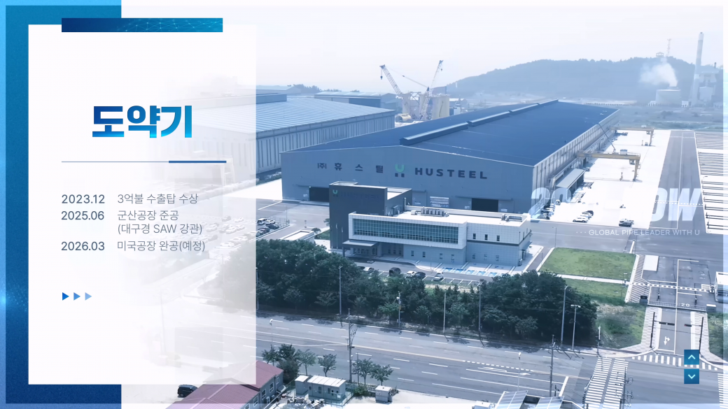 강관 제조 전문 기업 휴스틸의 기업 홍보영상입니다. 그룹사 소개를 비롯해 연혁, 전국 사업장, 주요 제품군을 종합적으로 담아냈으며, 각 공장별로 특화된 설비와 제품별 공정 과정을 촬영 기법으로 생동감 있게 표현했습니다. 또한 대표 제품군은 적용 환경을 3D그래픽으로 구현해 기술 이해도와 전달력을 높였습니다.